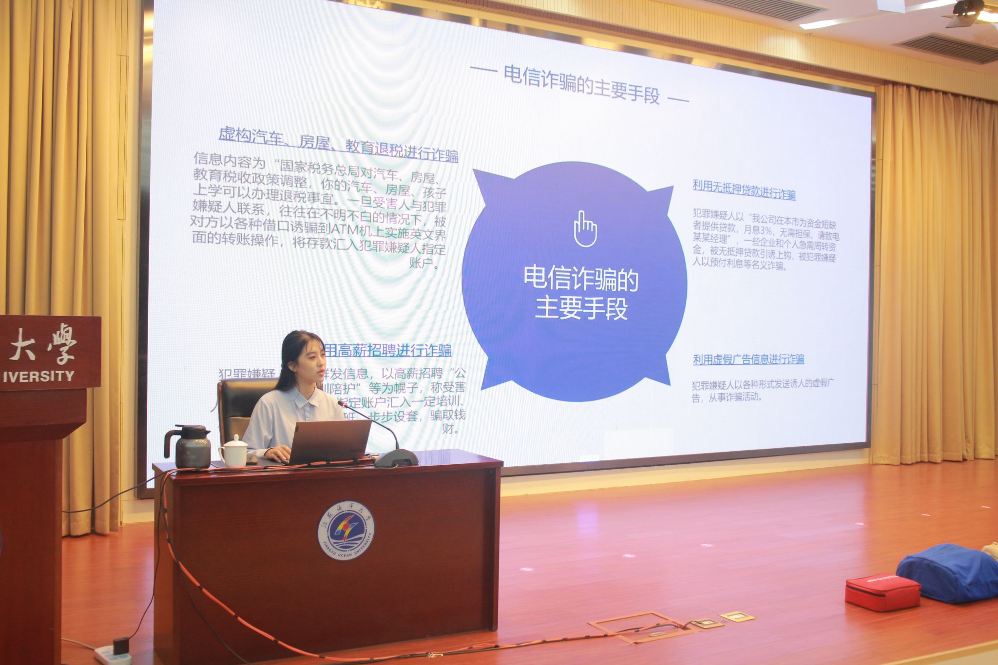 会上,防诈专员许月为同学们带来了题为《预防电信诈骗》的精彩分享。她结合当前高发的电信网络诈骗典型案例,详细讲解了如何识别和防范各类诈骗手法,并强调要牢记“三不一多”原则,提醒同学们务必做到“不听信、不透露、不点击、多核实”,时刻保持警惕,守护好自己的财产安全。