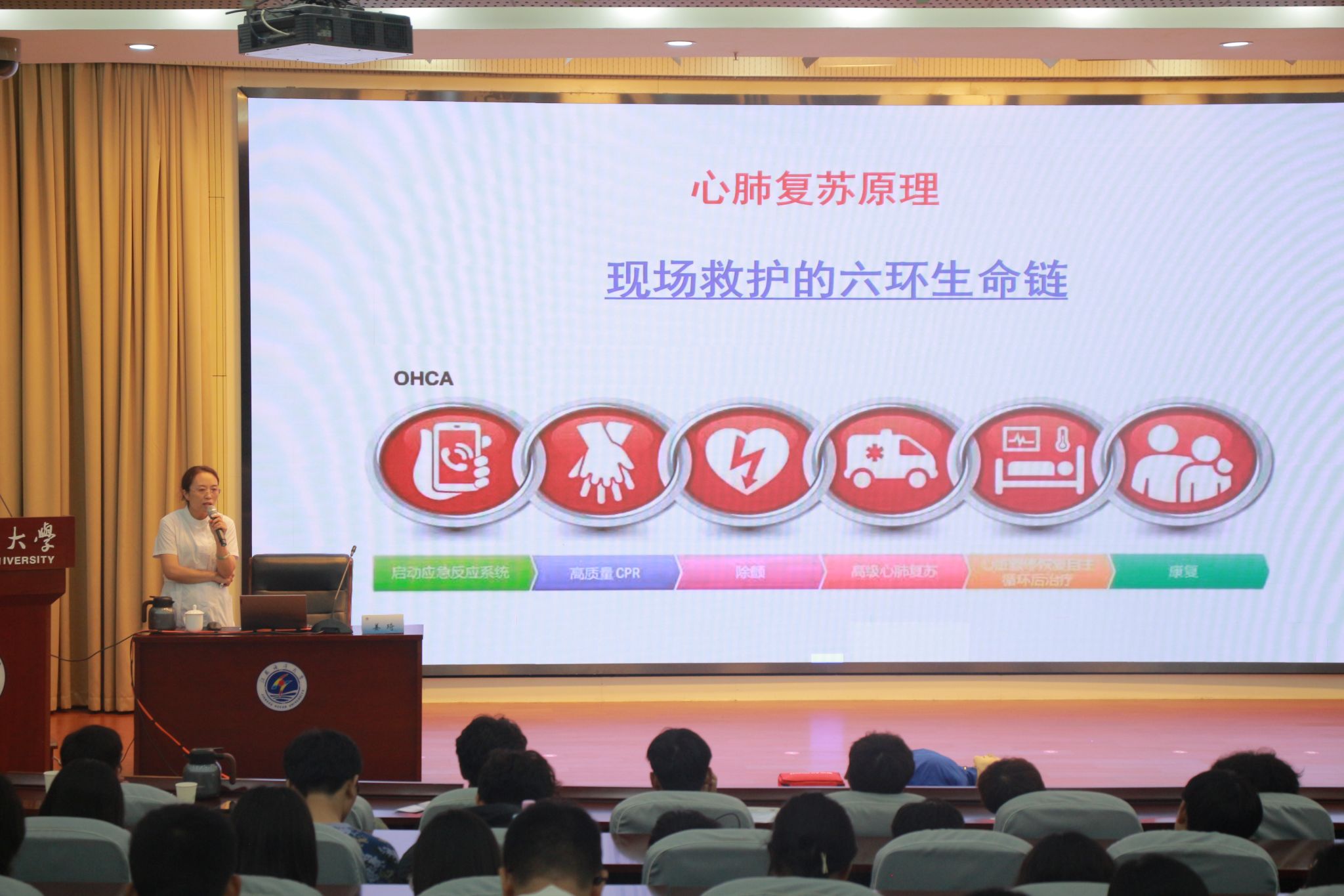 接着,姜琦老师为同学们进行了急救知识普及培训。姜科长以《“救”在身边——守护新生》为主题,着重讲解了心肺复苏(CPR)的操作流程、自动体外除颤器(AED)的使用方法等紧急情况的现场处置措施。通过理论阐述与模拟演示相结合的方式,姜科长将专业的急救知识变得通俗易懂,强调了“黄金救援”的重要性,并鼓励同学们在确保自身安全的前提下,勇于向需要帮助的人伸出援手。现场互动踊跃,学习氛围浓厚。