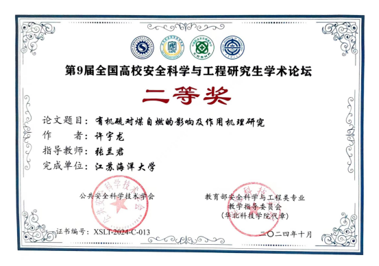 会议围绕安全科学与工程学科领域的教育教学、人才培养、学科建设和科学研究等进行了深入研讨。同时举办了第7届全国高校安全科学与工程青年教师教学大赛及第9届全国高校安全科学与工程研究生学术论坛和第10届全国高校安全科学与工程大学生实践与创新作品大赛获奖作品颁奖仪式。由我院张兰君老师指导,研究生许宇龙负责的作品《有机硫对煤自燃的影响及作用机理研究》在第9届全国高校安全科学与工程研究生论坛荣获二等奖。